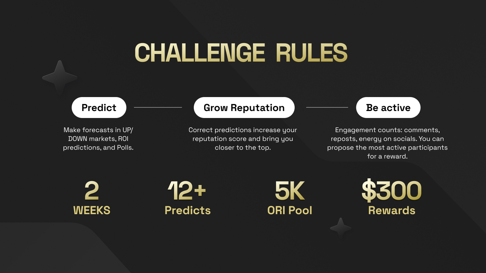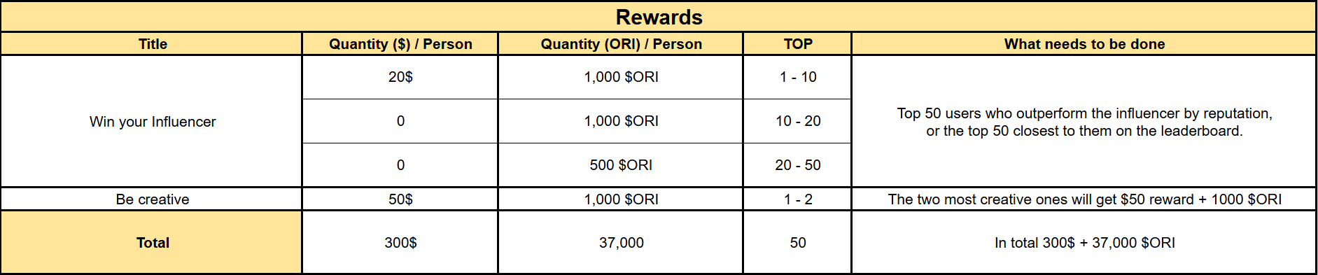 The Top 3 participants will be awarded with the “OG” user type/badge, recognizing them as early active users of the platform. This badge comes with unique benefits: additional ORI allocation (+400 ORI) and a Reputation threshold (a minimum reputation floor that prevents your score from dropping below a certain level - "5").