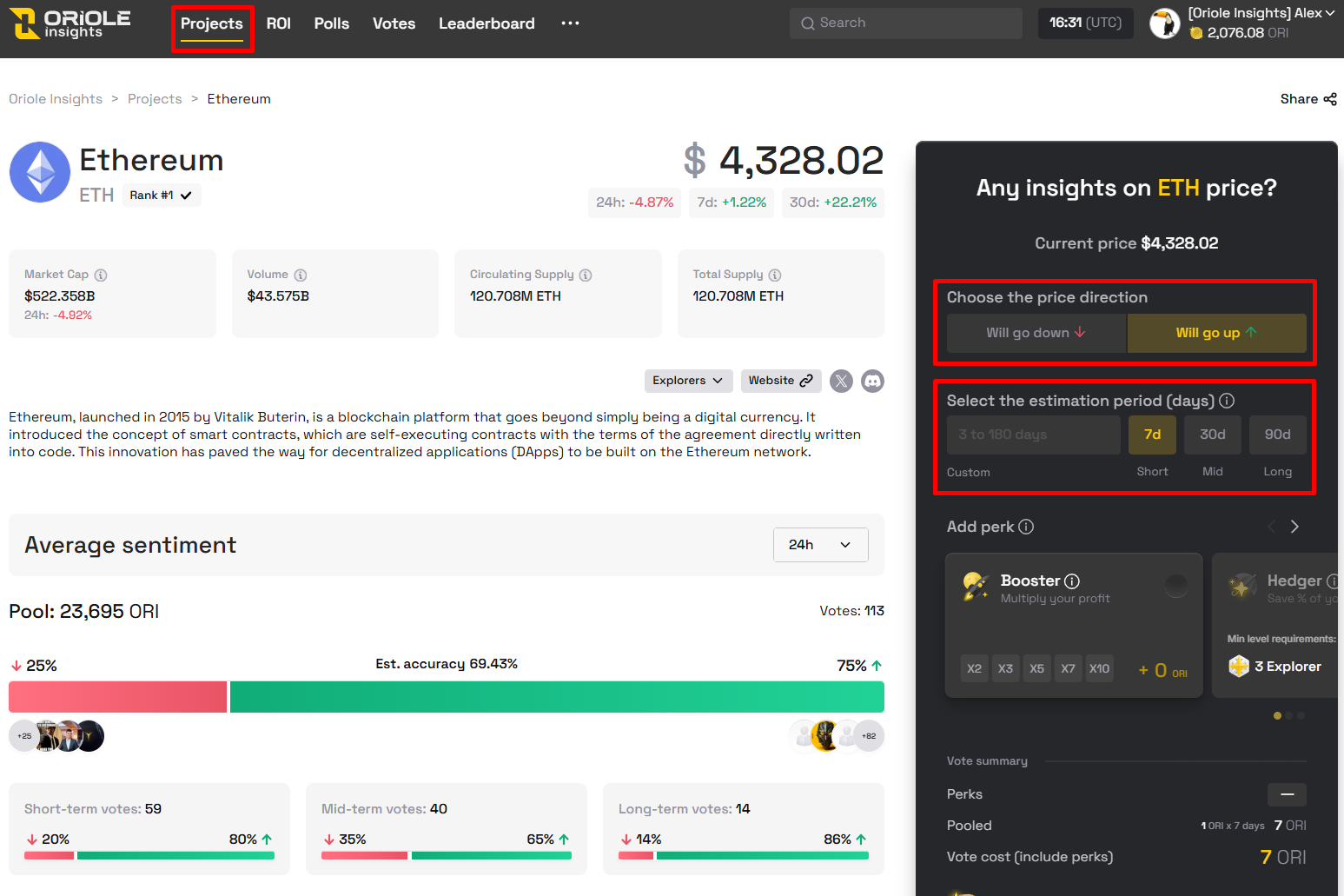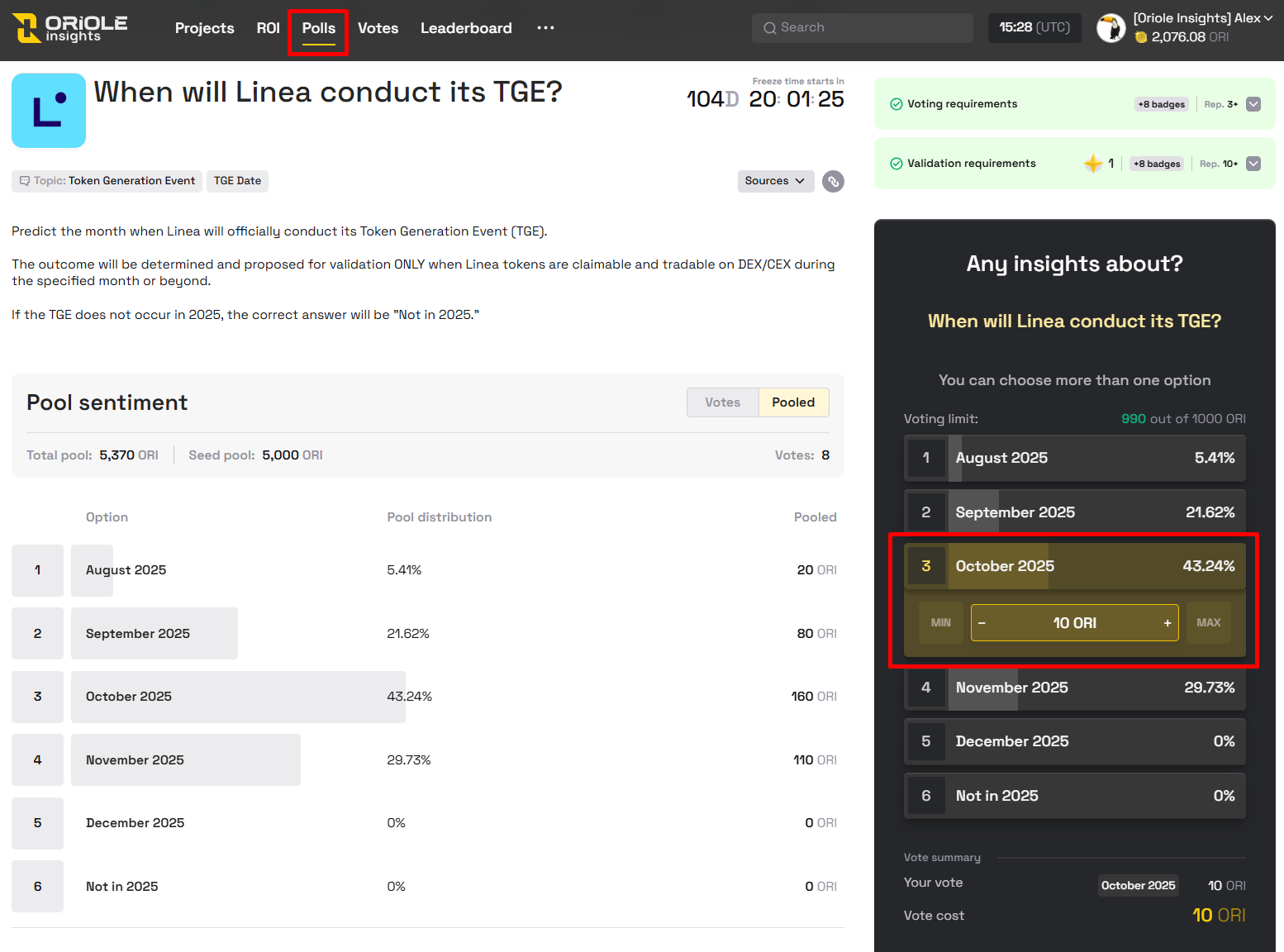Finally, make predictions on Oriole Insights — this is where the real challenge happens. Your goal is to increase your reputation score, which will affect your position on the leaderboard.