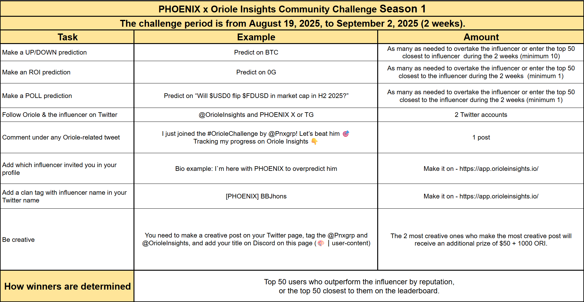 Each “Beat Your Influencer” challenge runs for 2 weeks and follows the same core format: participants compete to outperform a featured influencer by building a stronger reputation score on Oriole Insights.