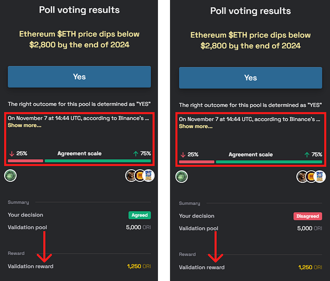 Validators are incentivized through a Validators’ reward pool — each pool differs from market to market. The reward will depend on a particular validator’s Reputation and the total number of Validators(disturbing rewards proportionally). Both agreeing and disagreeing validators are eligible for rewards, fostering a balanced view.