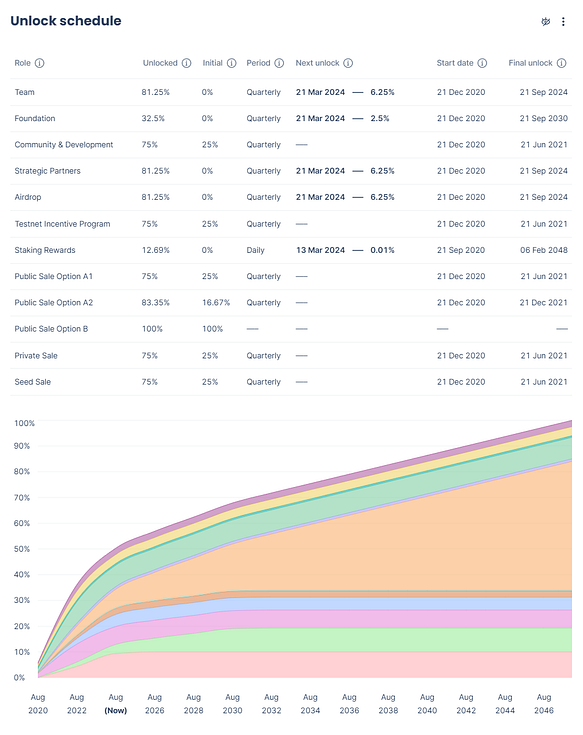 Post-TGE, not all tokens are thrown into the market simultaneously. The token unlock schedule is a roadmap that details when the reserved or locked tokens (those not part of the initial circulating supply) will be released into the market. This schedule gradually releases tokens held by the project’s team, advisors, and early investors.