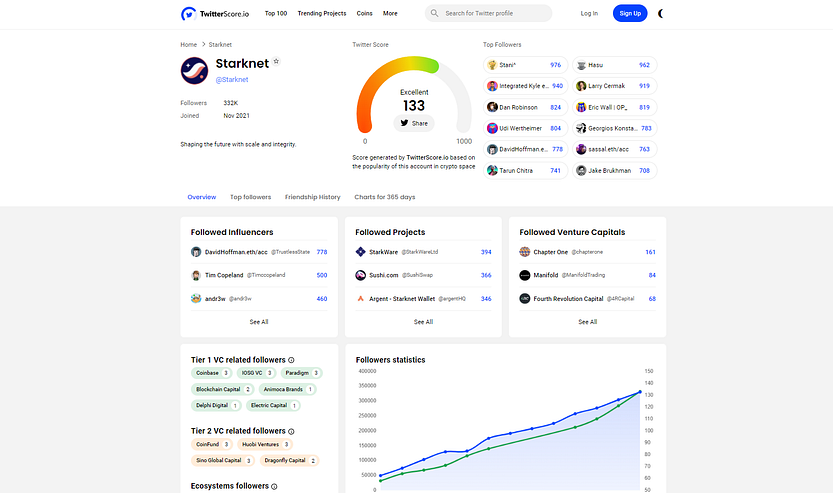 - TwitterScore.io: Helps evaluate the influence and engagement levels of a project’s Twitter account.