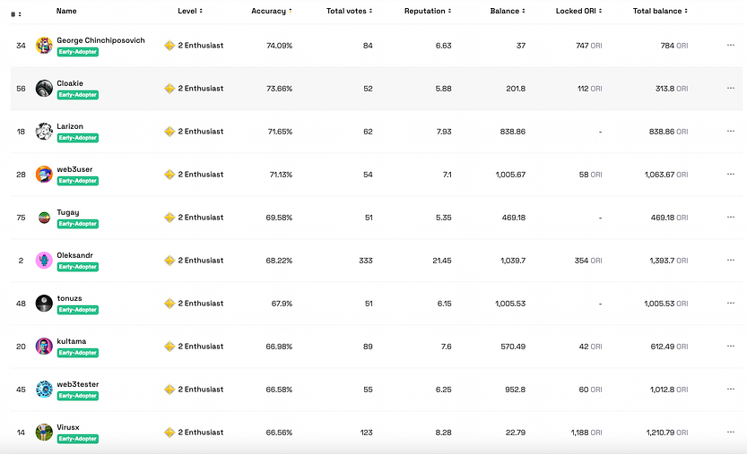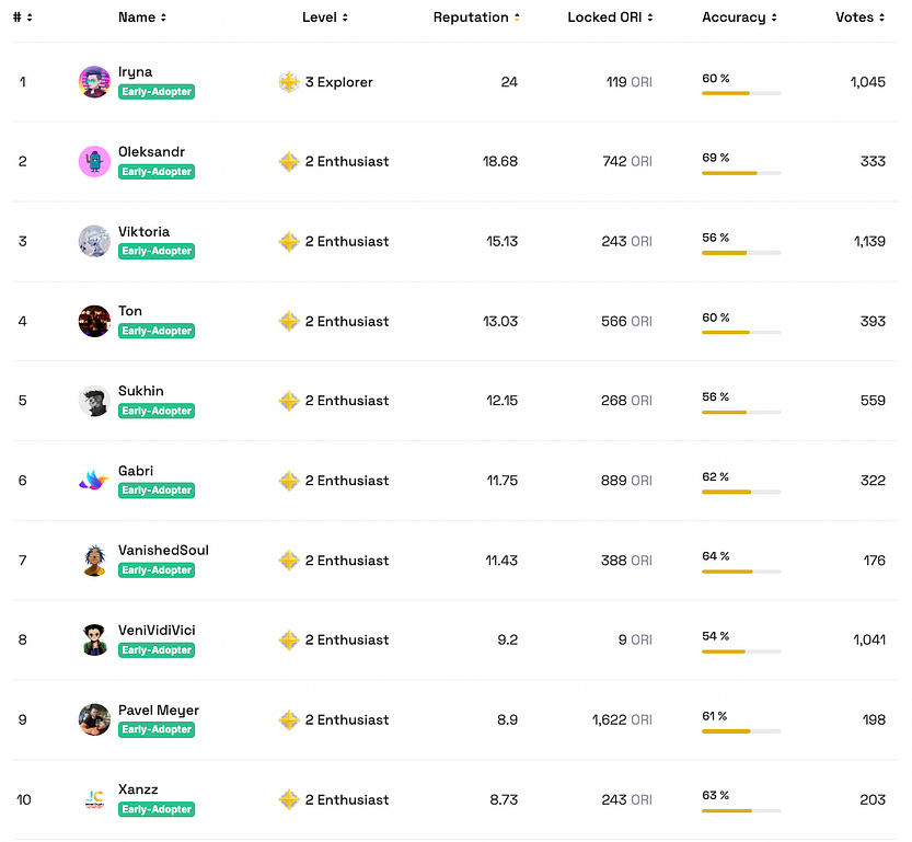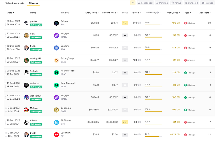 George Chinchiposovich is our leader with an impressive 74.09% accuracy rate after 84. He is notable for his diverse strategy. His latest votes include both “UP” and “DOWN” and all the term periods. The most recent placed vote is a 90-day vote that demonstrates his approach to the market. He also uses hedger perks on long-term votes, minimizing losses and saving ORI.